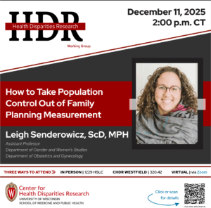 The Health Disparities Research Working Group is delighted to welcome Leigh Senderowicz, ScD, MPH as our final presenter for 2025. Join us on Thursday, December 11 for a discussion of her current work: